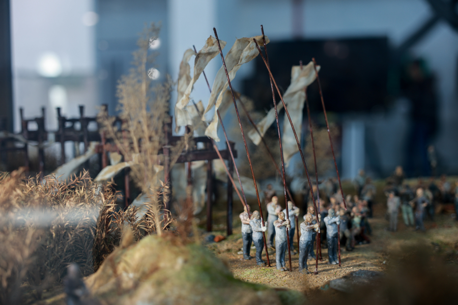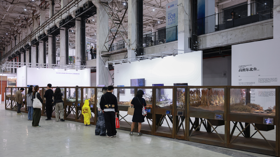 中国美术学院跨媒体艺术学院的牟森教授与媒介展演系33位师生历时140天共同完成的微缩场景模型《高密东北乡》长达21米,在现场颇为引人注目。这件作品作为江苏大剧院原创话剧《红高粱家族》项目的组成部分,以自然博物馆标本展柜作为展示形态,由二十个标准“景箱”生动展现文学作品中的标本式图景,为华语文学经典的视觉转译探索全新的路径。